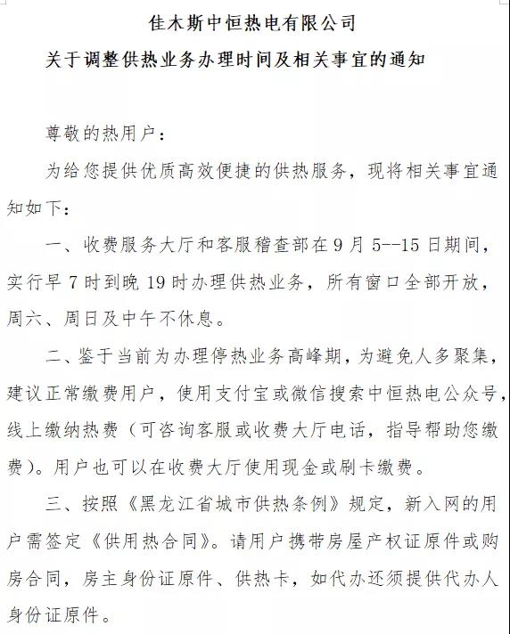 ★微信“華電能源佳木斯城市供熱”公眾號及工商銀行、建設銀行各網點。